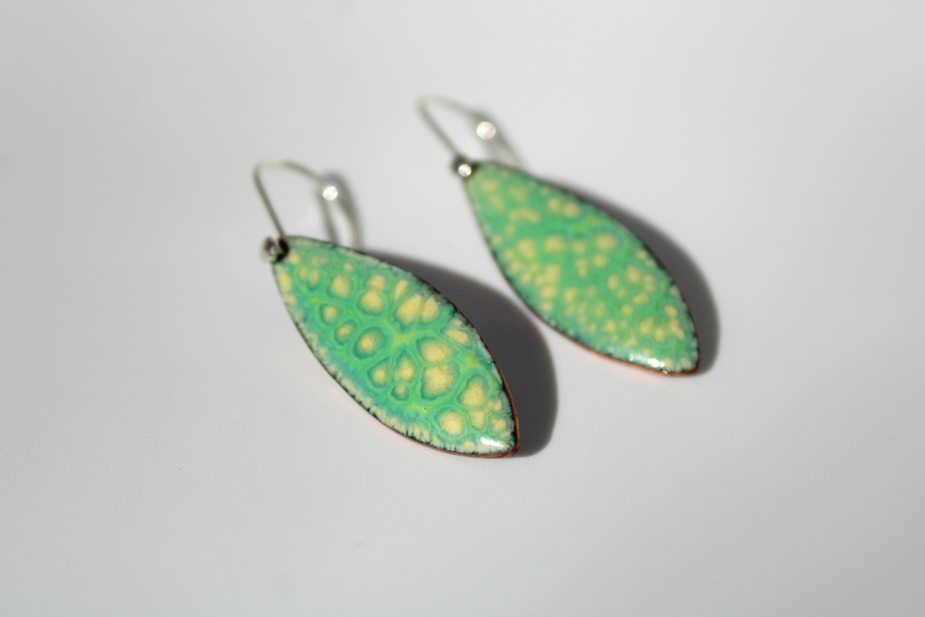 Each loop is precisely cut from a sheet of copper, then meticulously hand-worked to create its graceful forms. They are enameled on both sides using a special technique called "craquelage" or "color incompatibility." This process involves layering powdered enamel, one layer of which, through a series of firings in the kiln, reveals the underlying layers. This interplay of colorful bursts gives each piece a unique texture and depth. Mastering this technique allows me to subtly influence the final patterns while still leaving room for a touch of random charm.